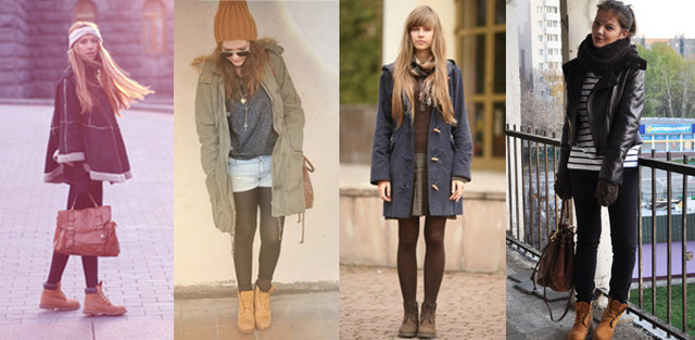 Нестандартно и оригинально смотрятся тимберледны с легким платьем и короткой курткой. Чтобы сделать образ более женственным и мягким, можно надеть модель на каблуке. Облегающие брюки, меховой жилет, безрукавка, корсет или гольф в сочетании с данными ботинками также прекрасно подойдут для вечеринки, похода в клуб и повседневного ношения.